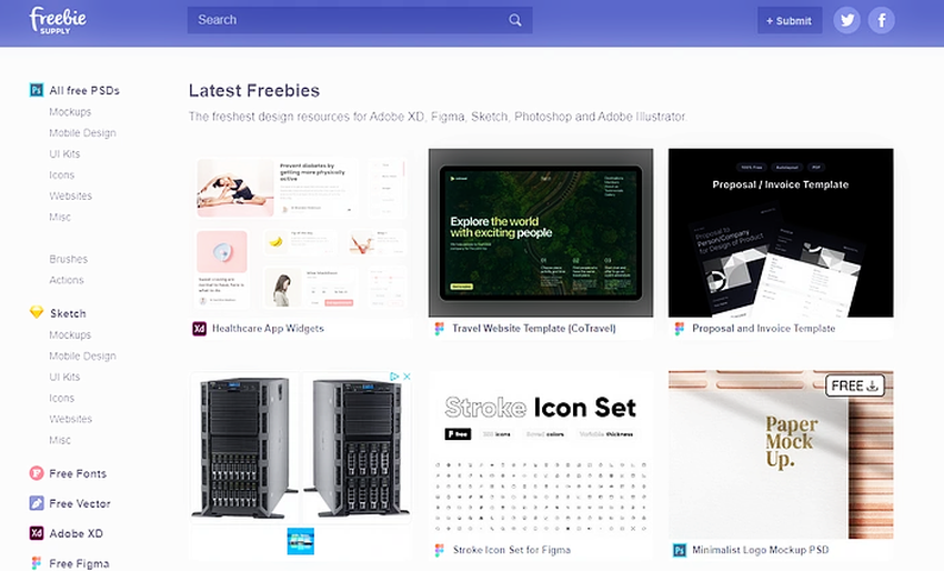 프리비 서플라이는 이러한 리소스를 하나의 단일 디렉터리로 컴파일하는 많은 사이트 중 하나입니다. 위의 스냅샷에서 스케치를 볼 수 있습니다. 300페이지 이상의 무료 콘텐츠가 있습니다.